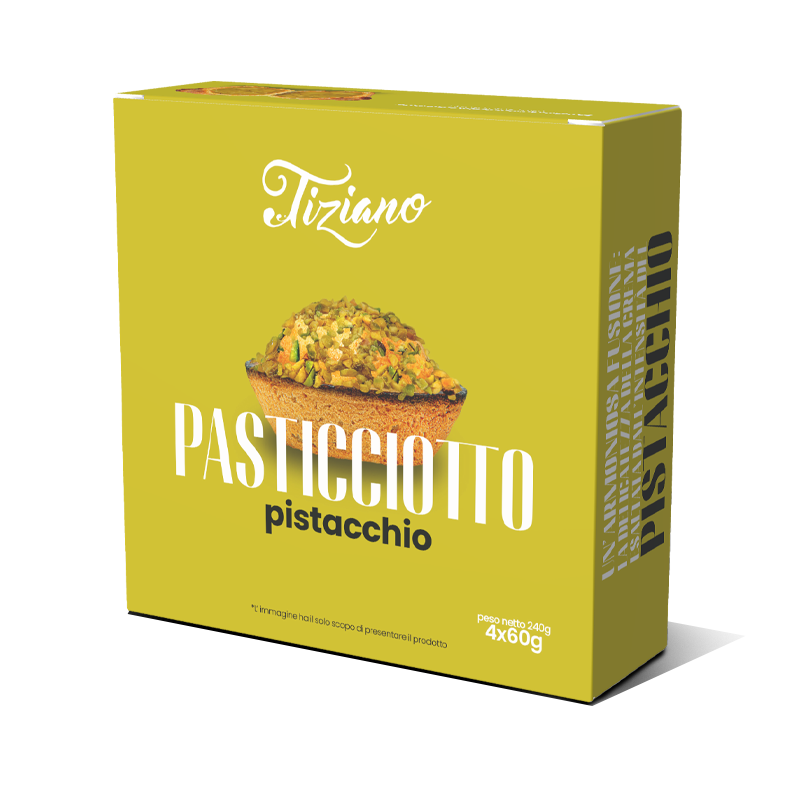 Farina 00, zucchero, acqua, strutto, uova, latte intero in polvere, burro, amido di mais, amido di riso, pasta di pistacchio 8% (pistacchio 99,9%), agenti lievitanti: bicarbonato d’ammonio, sale, vanillina.